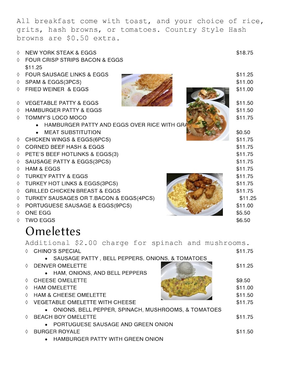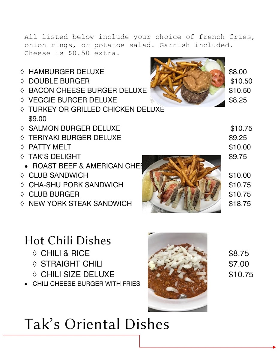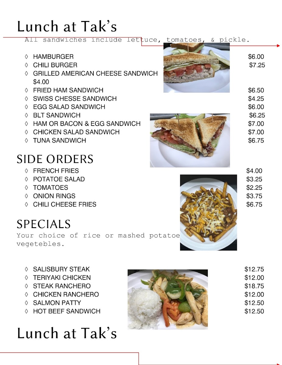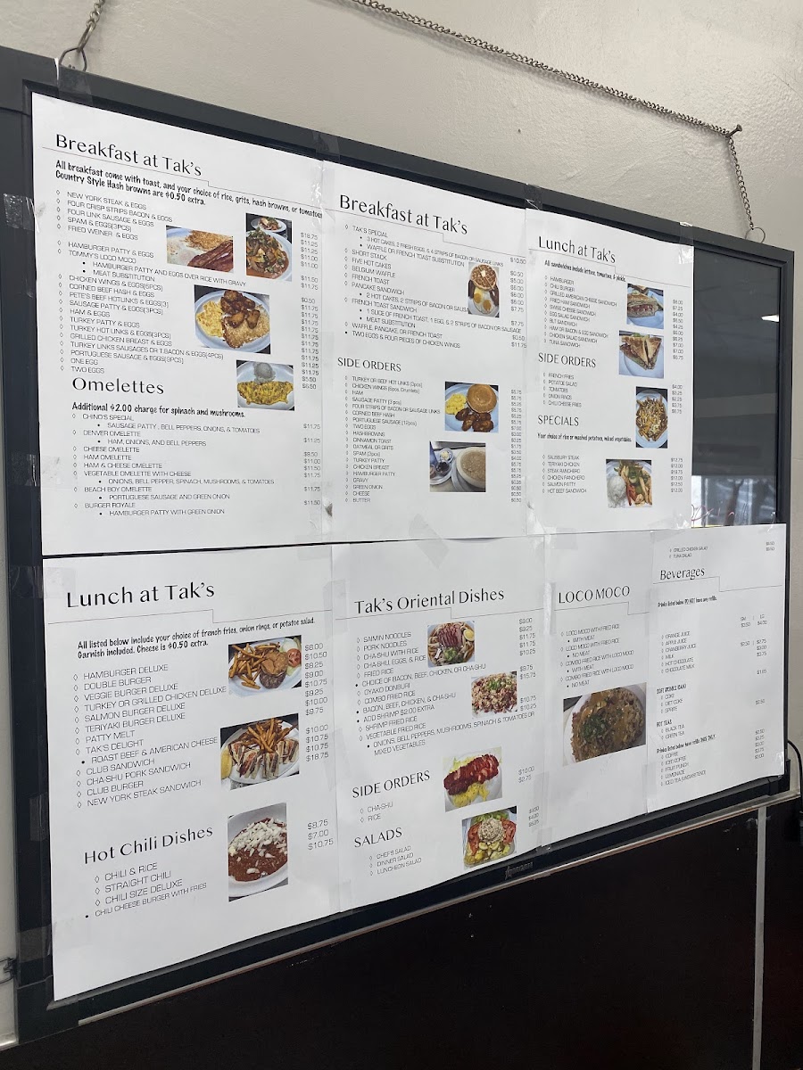 For lunch, explore their Chili and Rice or the indulgent Chili Size Deluxe chili cheeseburger for $14.95. Reviewers rave about the authentic flavors and friendly service, with standout dishes like the loco moco with cha shu being a favorite. Whether you’re a breakfast aficionado or a lunch enthusiast, Tak's is the perfect spot to revel in delightful comfort food that leaves a lasting impression.