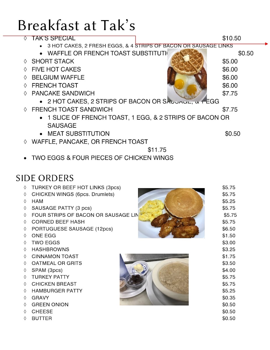 Welcome to Tak's Coffee Shop, an esteemed gem nestled at 3870 Crenshaw Blvd in Los Angeles. Renowned for its hearty breakfasts and nostalgic diner vibe, Tak's invites you to indulge in culinary comfort. Take a seat and savor the New York Steak and Eggs Breakfast, where succulent steak meets perfectly cooked eggs, all for just $23.75. Craving something classic? The 4 Crisp Strips Bacon and Eggs or Pork Sausage and Eggs, each priced at $15.50, promise satisfaction with every bite.